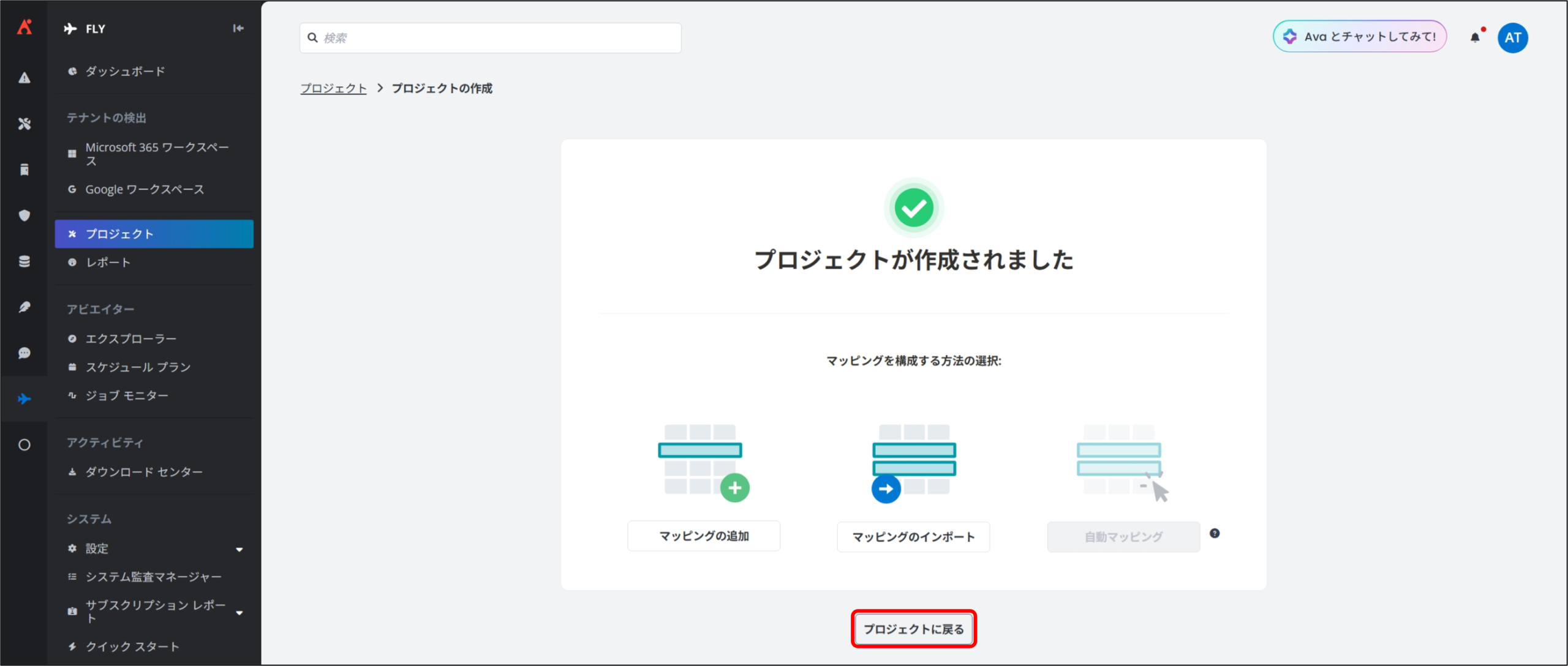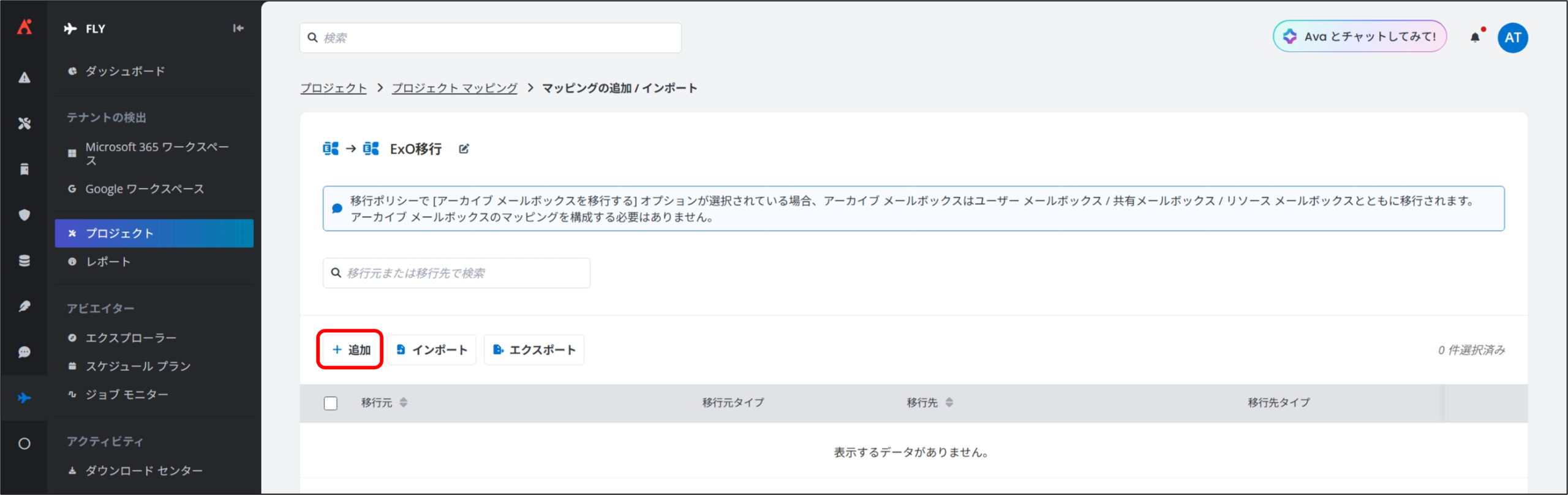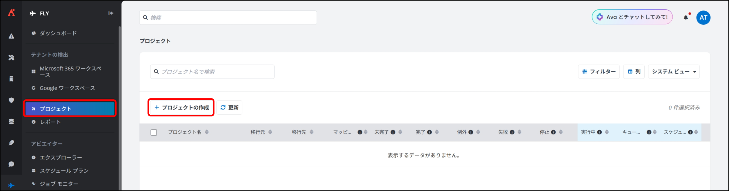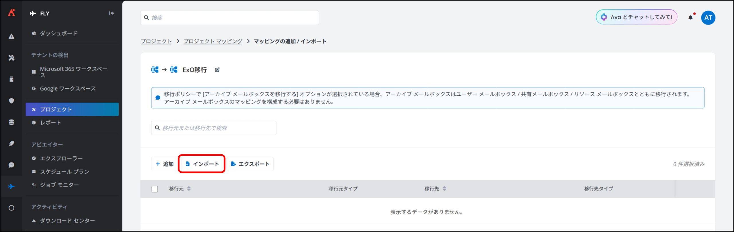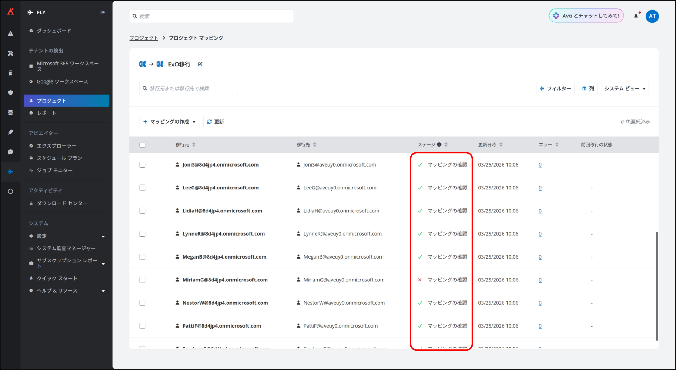 Fly では、移行準備が整ったプロジェクト マッピングに対して、「完全移行」を実行することで、実際のデータ移行を開始します。