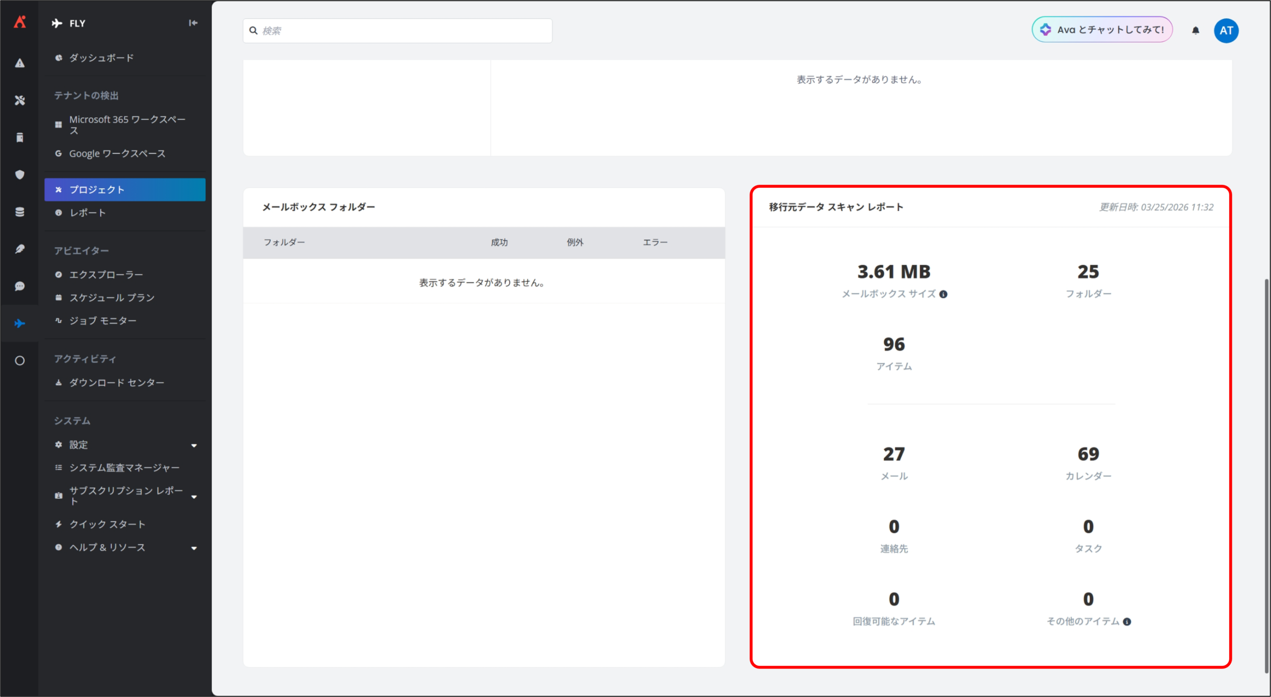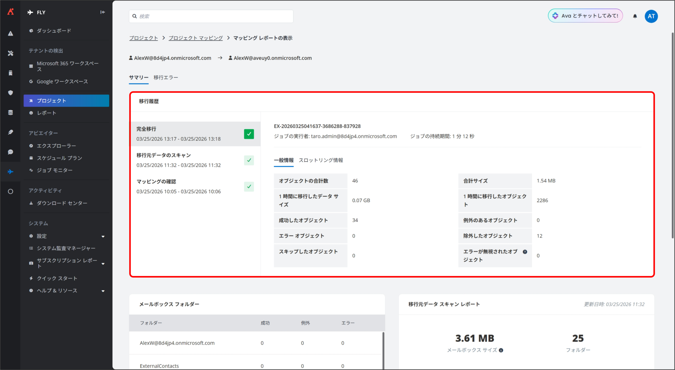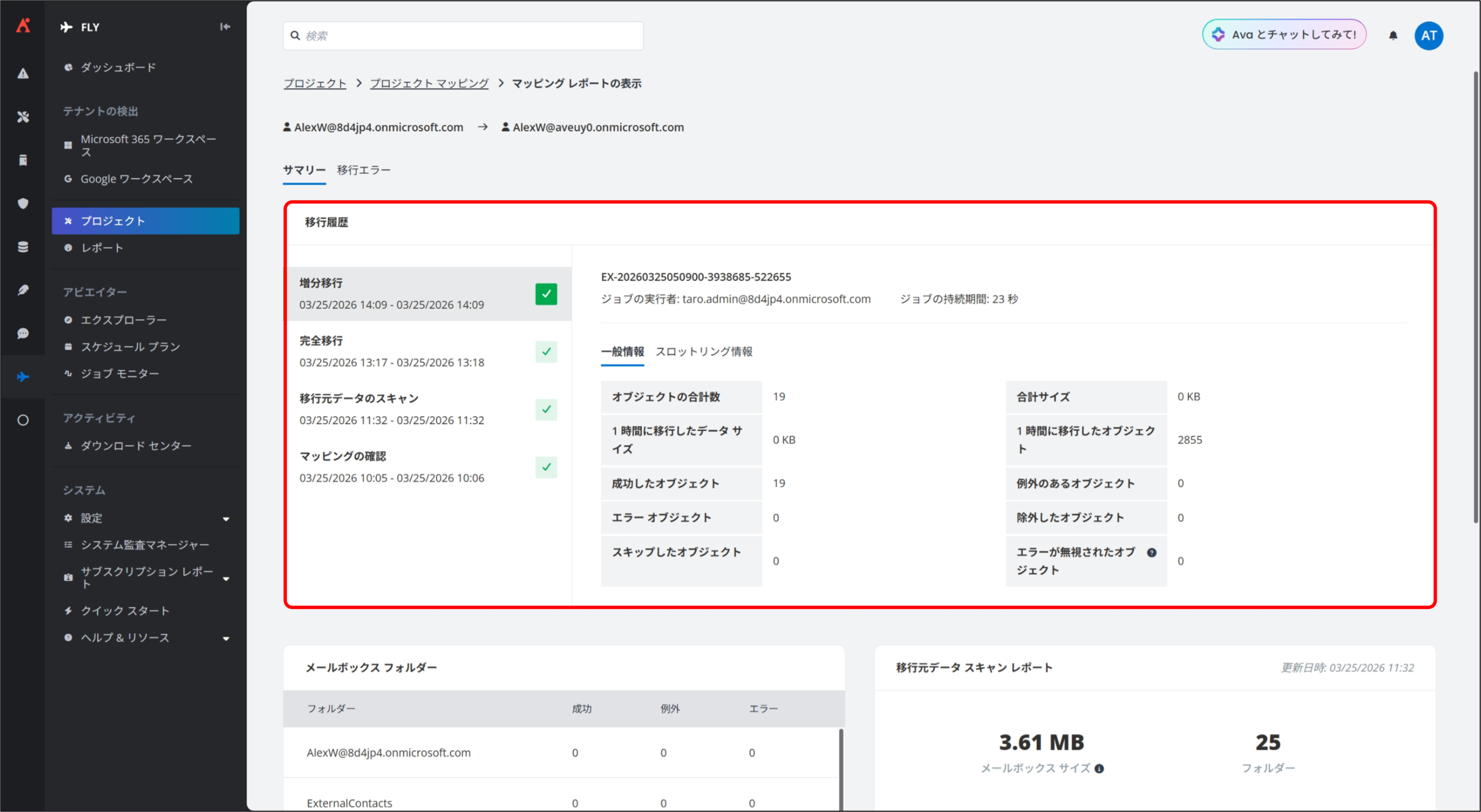 3. 移行元データ スキャン レポート から移行元メールボックスのメールボックス サイズおよびオブジェクト数を確認できます。