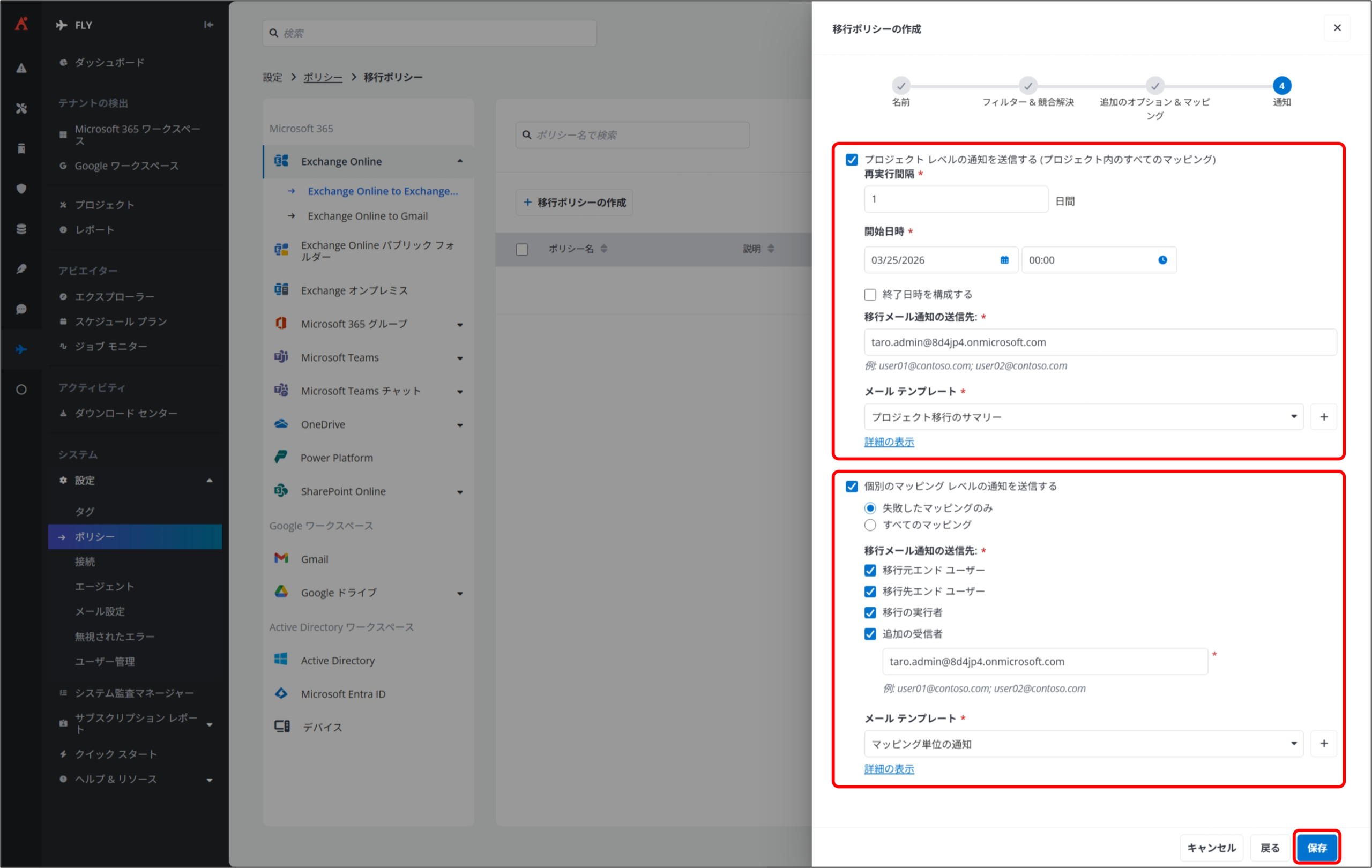 移行ポリシーを設定することで、移行対象とするオブジェクト、詳細な移行方法やルール、通知設定などを一元的に定義することができます。