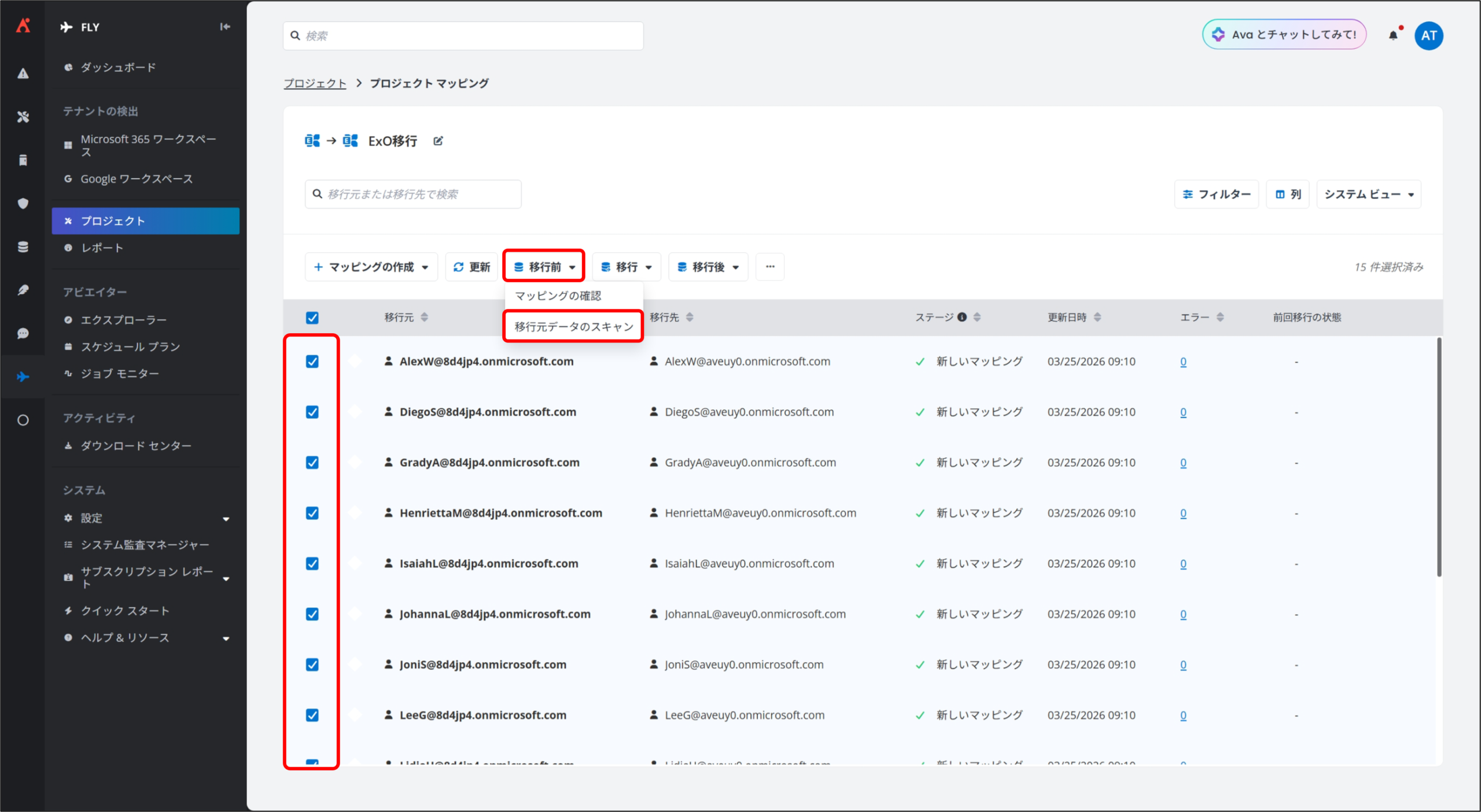マッピングされたメールボックス / 配布リスト / 動的配布リストが、移行処理で使用可能かどうかを分析します。 - 移行元データのスキャン