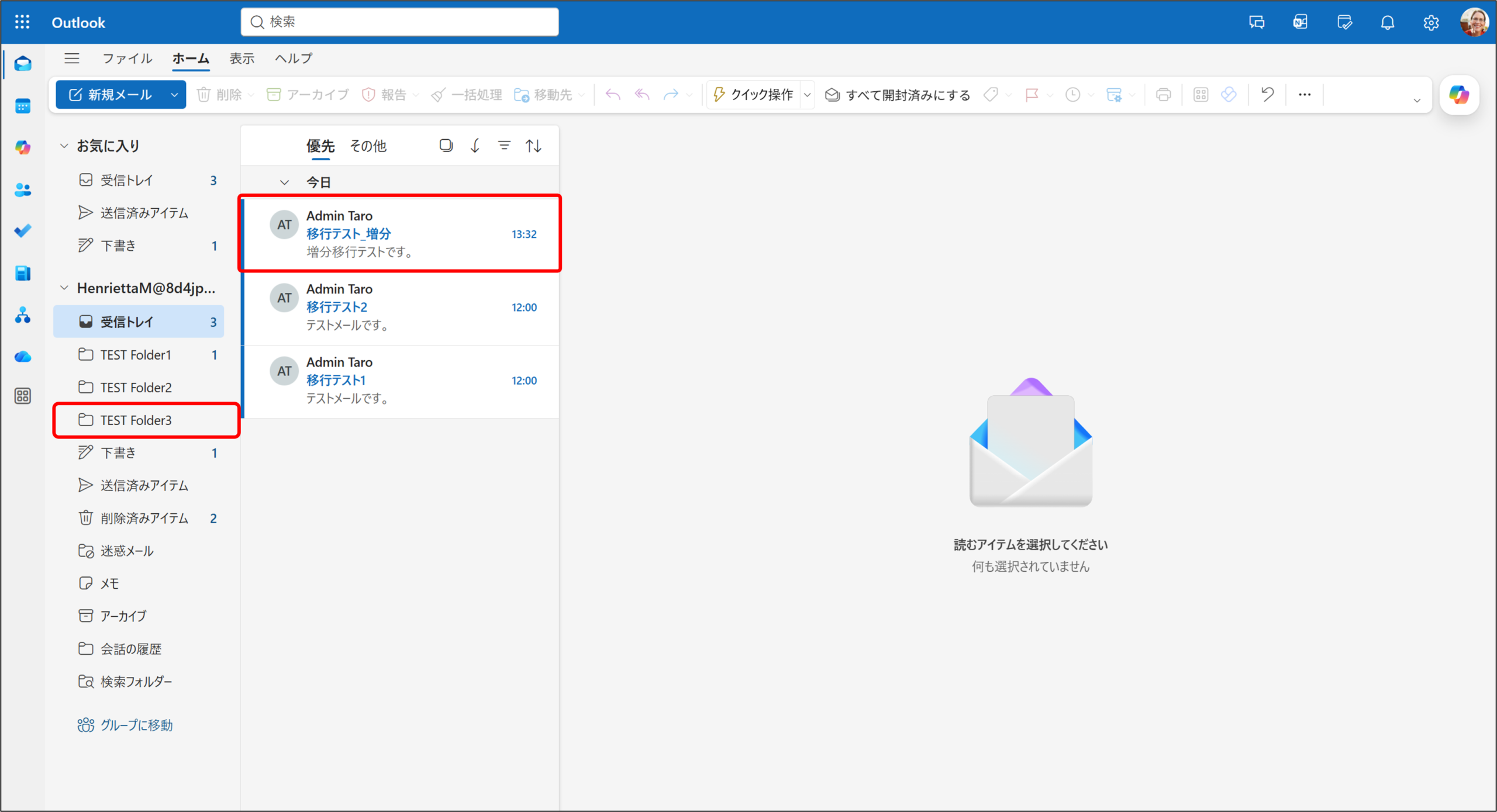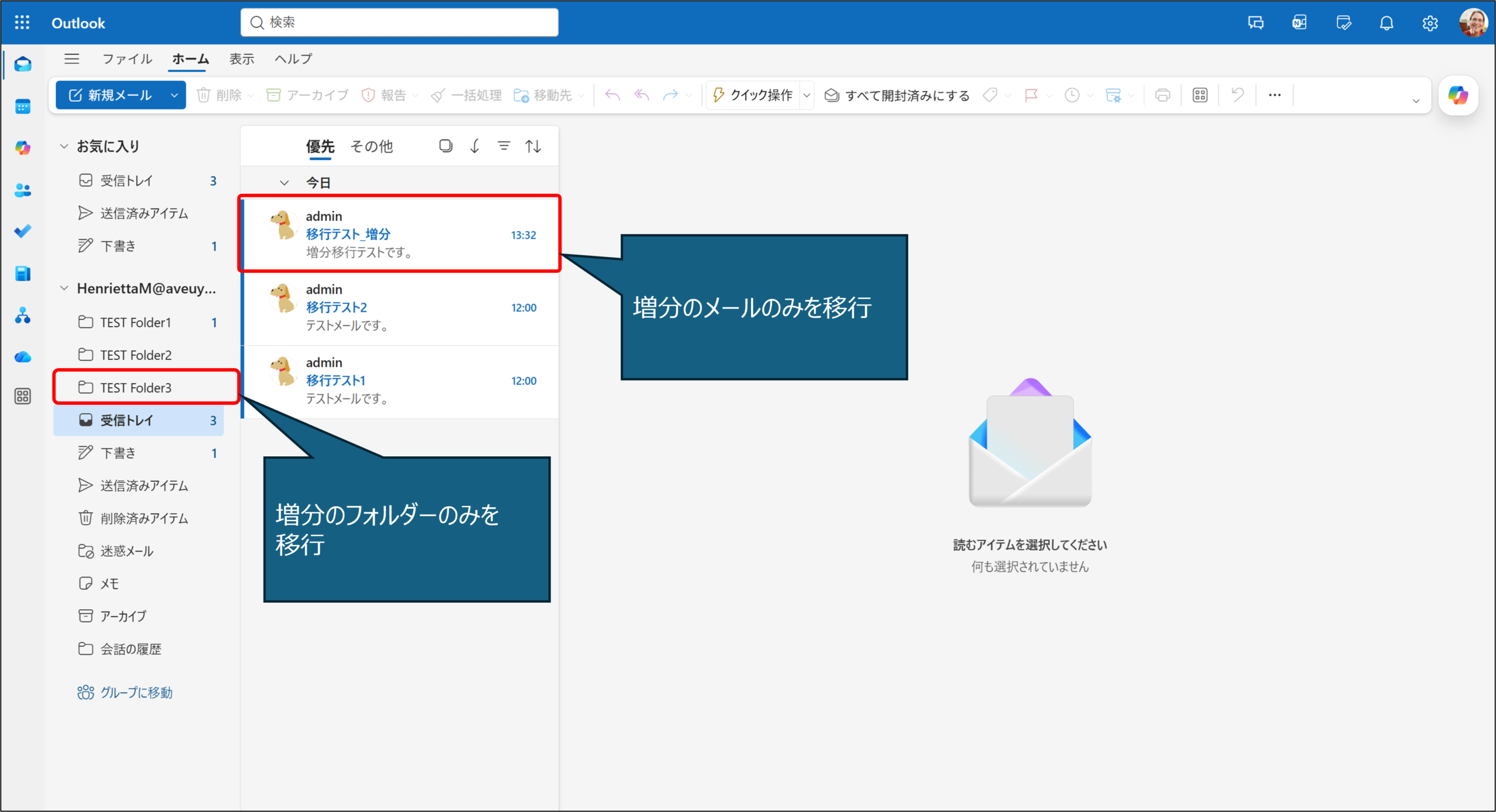 移行元テナントと移行先テナントを比較し、増分のみのフォルダー構造、およびメールアイテムが正しく移行されていることを確認できます。