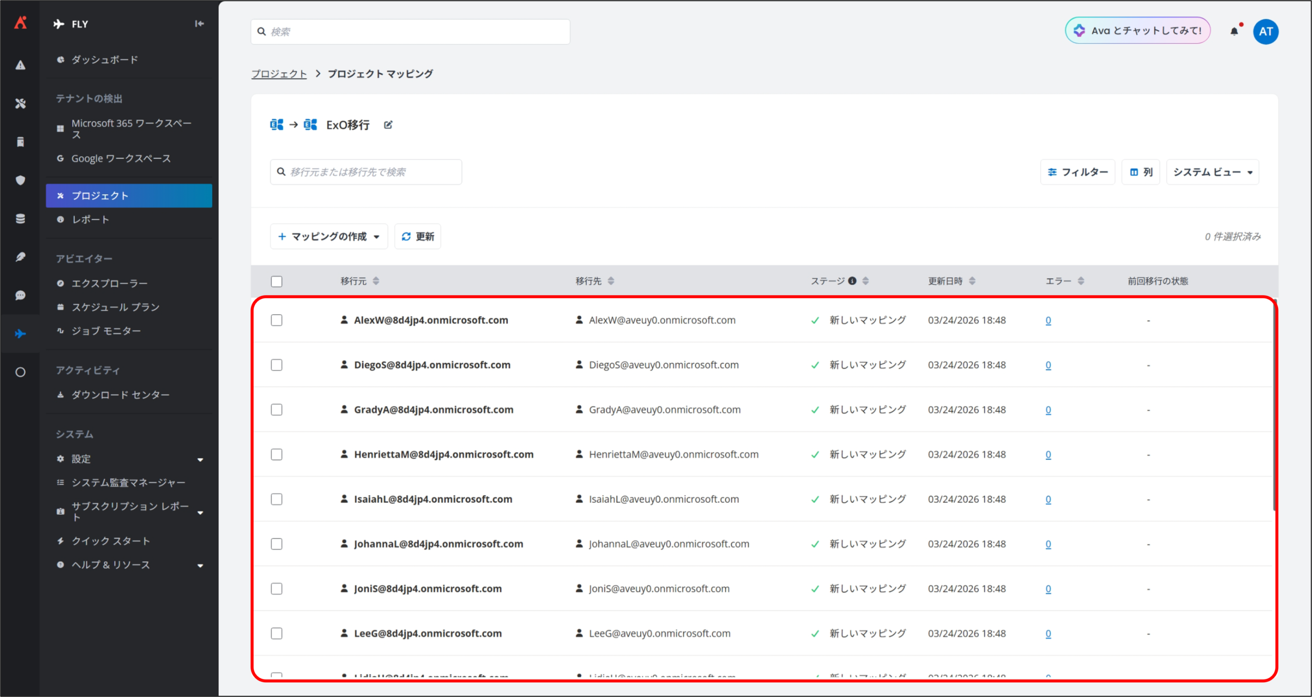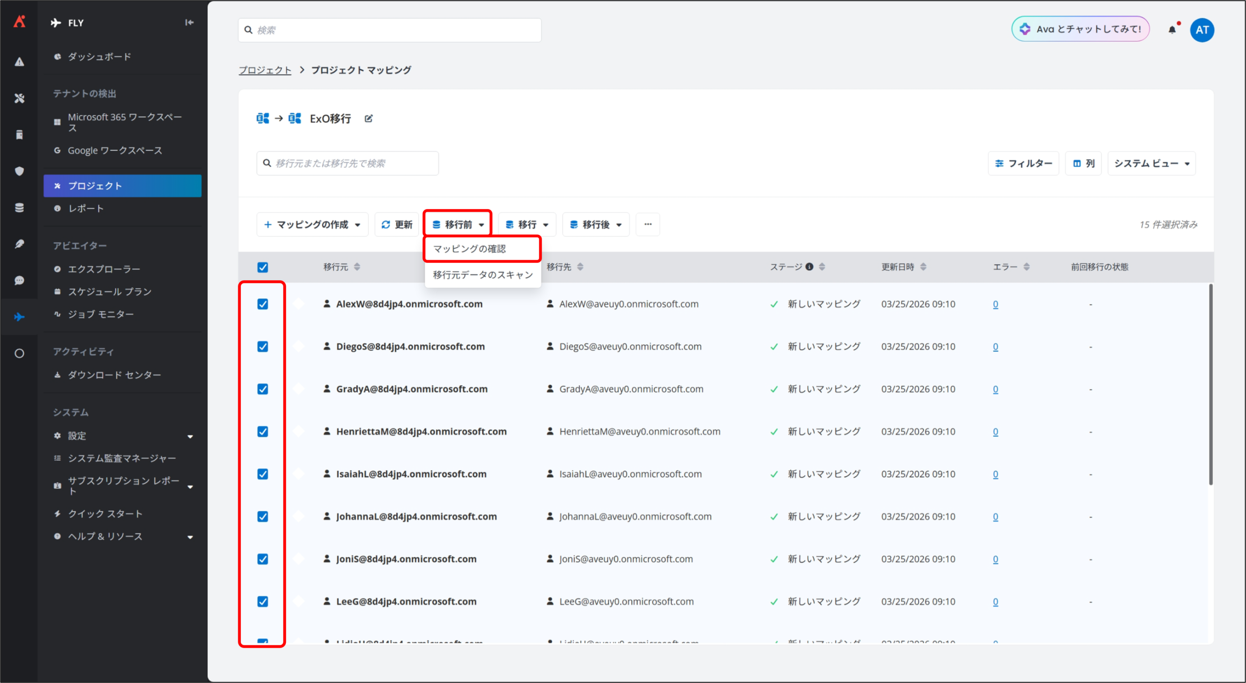 4. プロジェクト マッピング 画面が表示されるので、移行実施対象のマッピングを選択して [移行] から [完全移行] をクリックします。