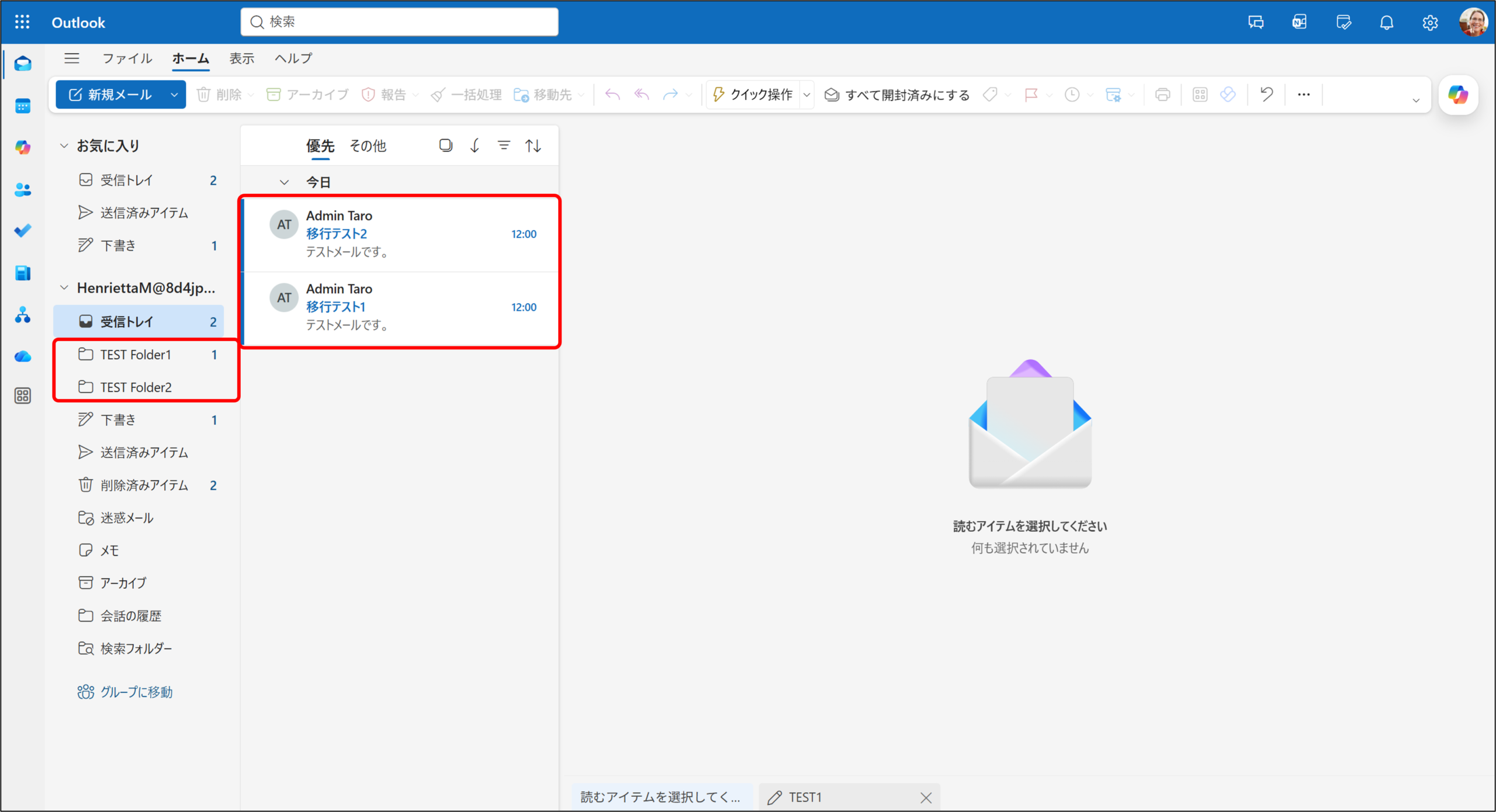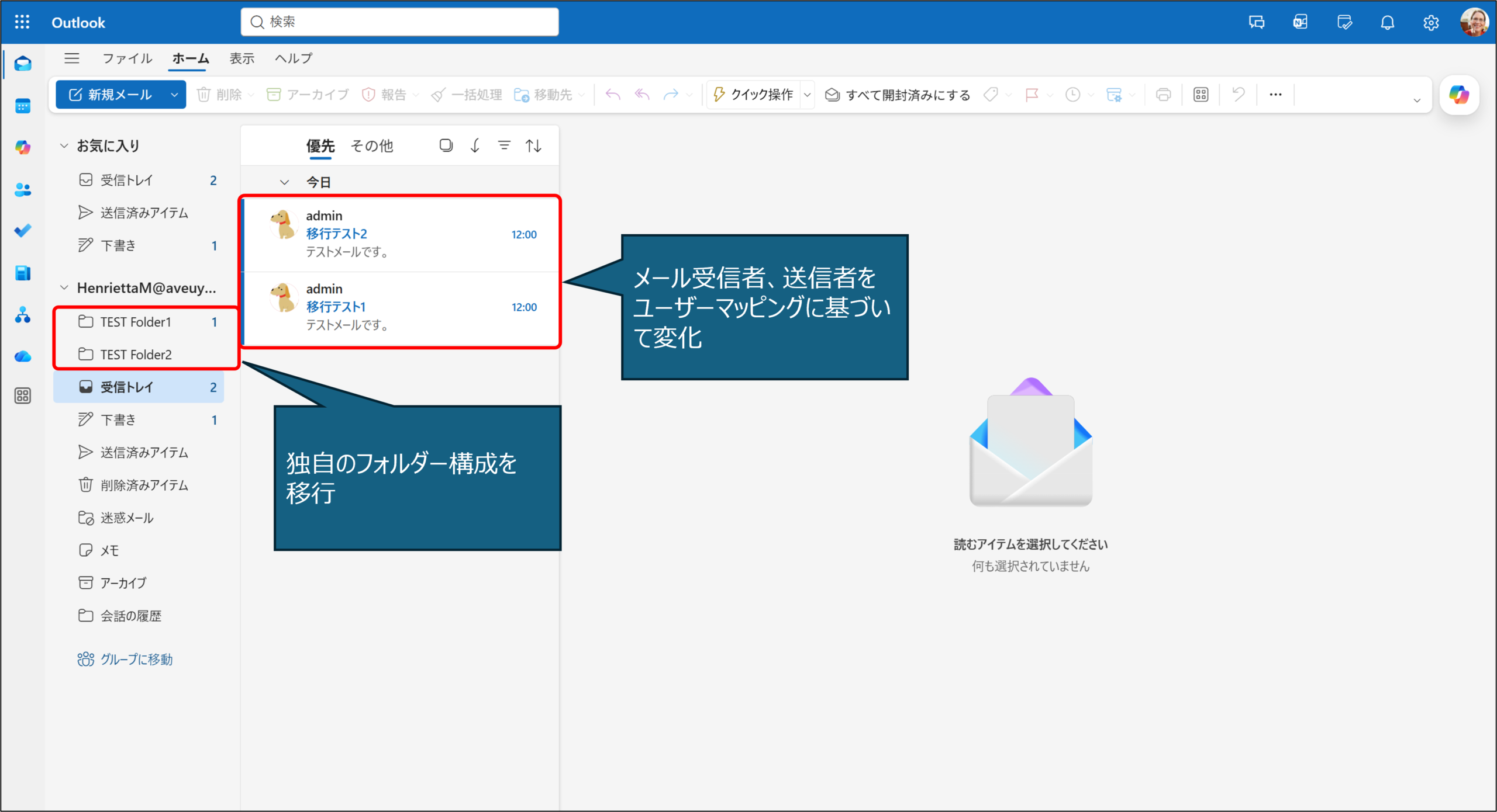 移行元テナントと移行先テナントを比較し、フォルダー構造が維持されていること、およびメールアイテムが正しく移行されていることを確認できます。
