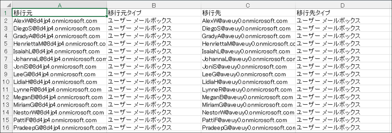 移行対象とする移行元メールアドレスを A 列に入力します。
