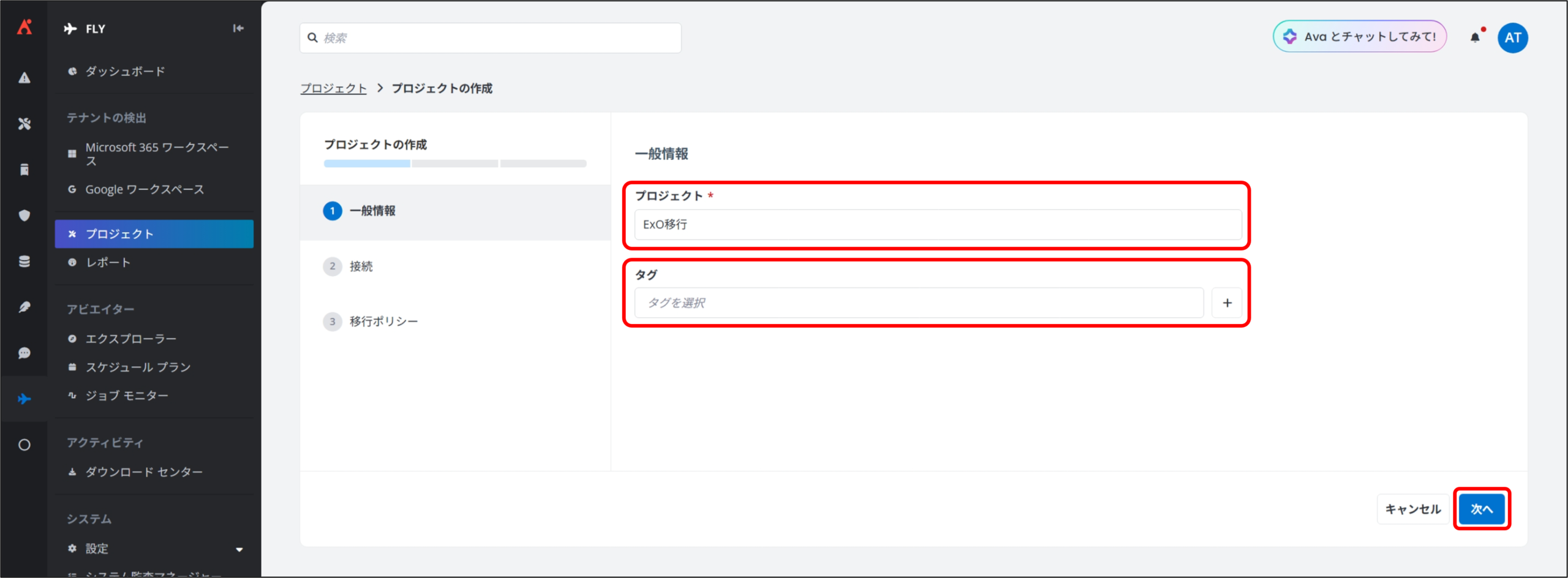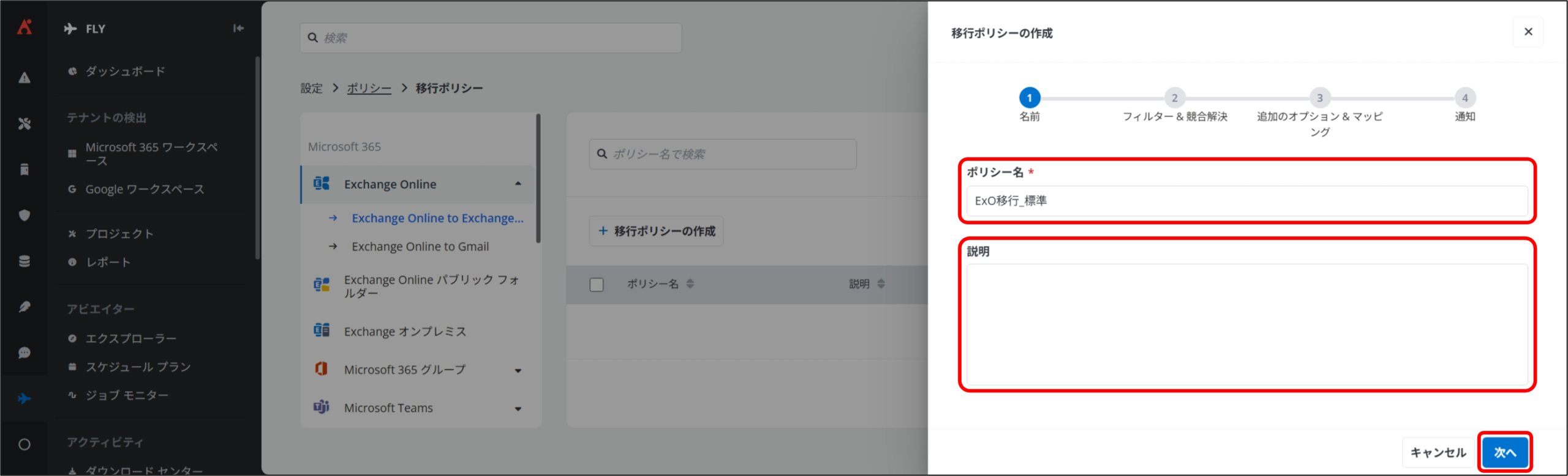 3. 移行ポリシーの作成 ①名前 画面が表示されるので、下記項目に任意の設定を実施して [次へ] をクリックします。