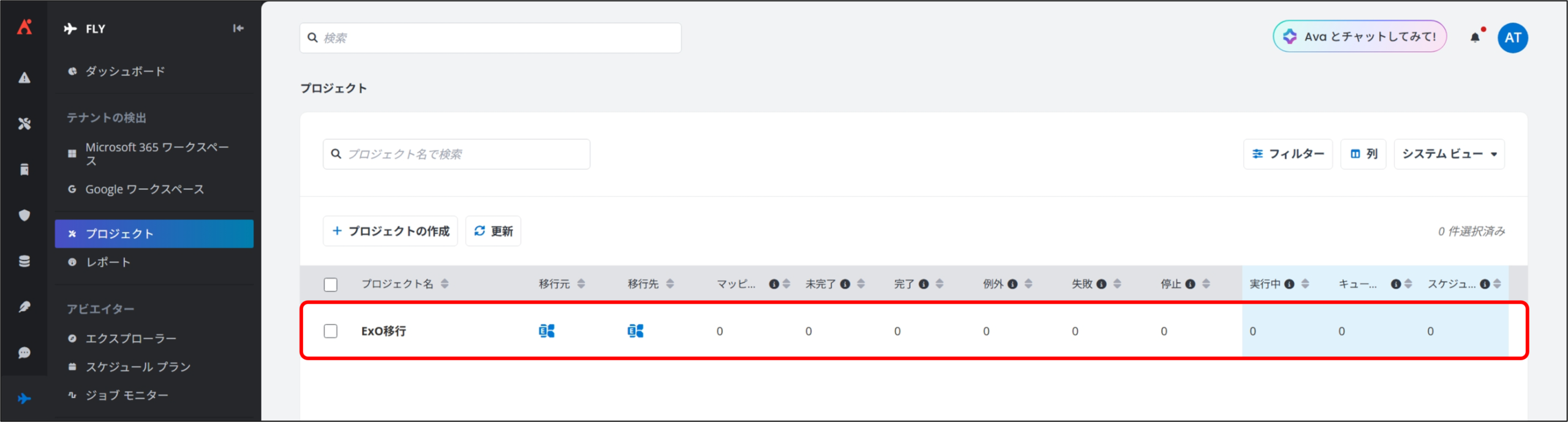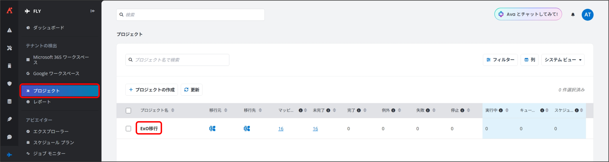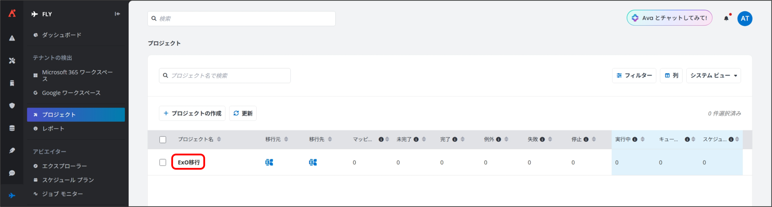 3. [プロジェクト] を選択し、Exchange Online 移行の事前設定 で作成済みの Exchange Online to Exchange Online のプロジェクトをクリックします。
