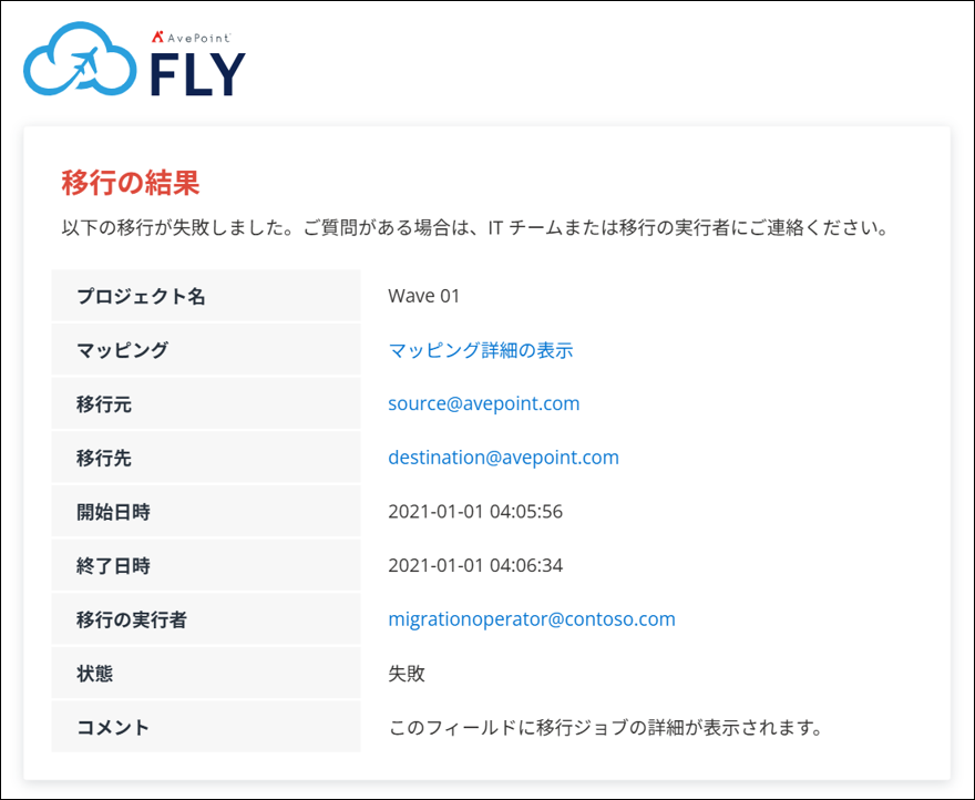 - 移行元メールボックスでフォルダー名を変更した、またはフォルダーを移動した場合、Fly は移行先に新しいメールボックス フォルダーを作成し、移行元フォルダー内のすべてのデータを移行先の新しいフォルダーへ移行します。なお、以前に移行先へ作成されたメールボックス フォルダーは削除されないため、移行先環境でデータが重複する可能性があります。