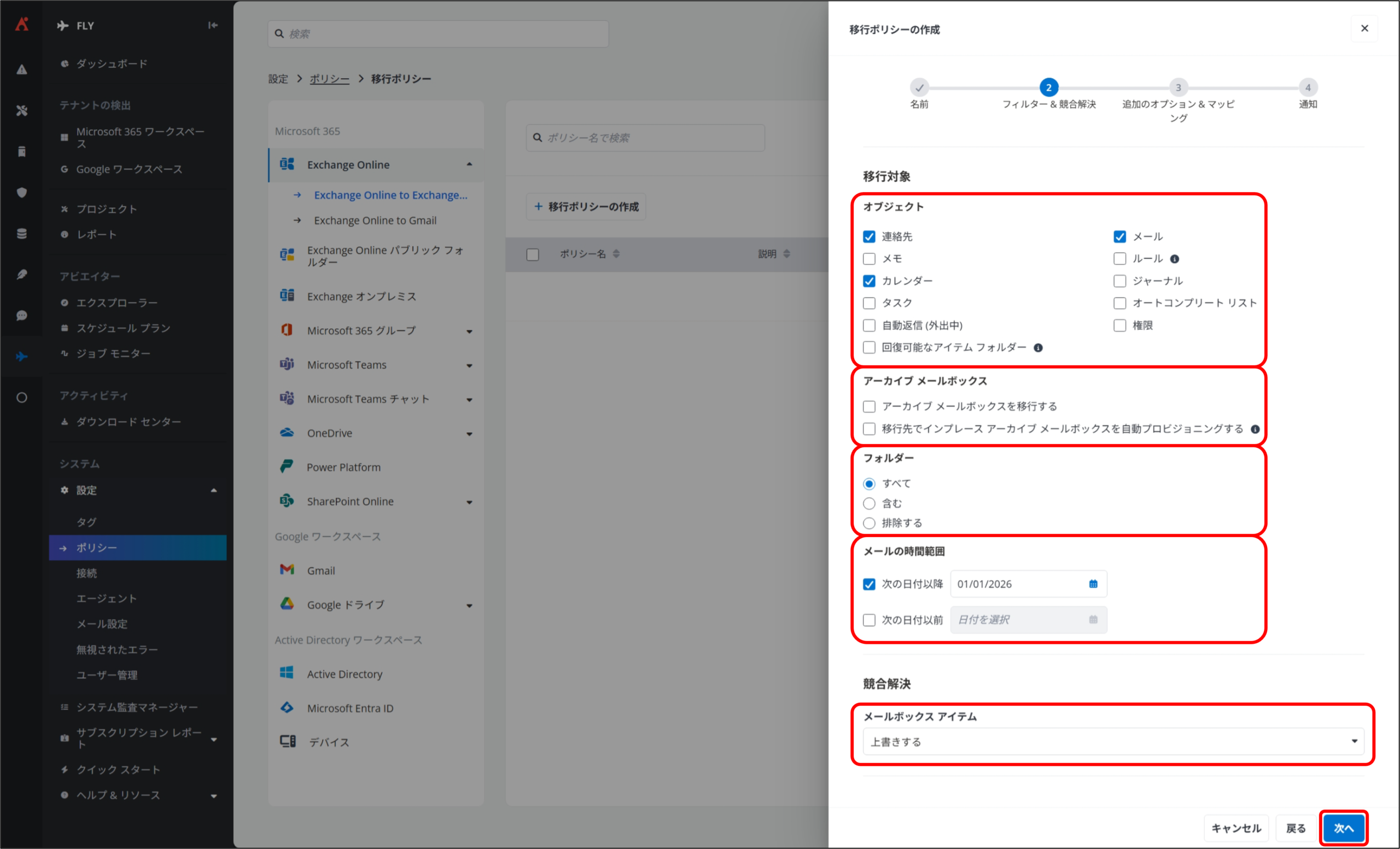 4. 移行ポリシーの作成 ②フィルター&競合解決 画面が表示されるので、下記項目に任意の設定を実施して [次へ] をクリックします。