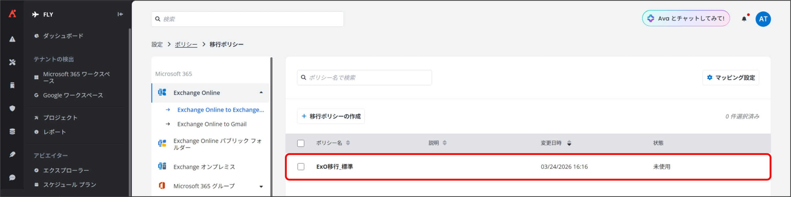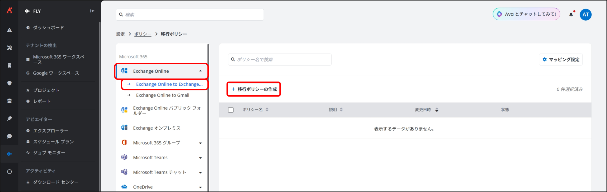 2. 移行ポリシー 画面が表示されるので、[Exchange Online] から [Exchange Online to Exchange Online] をクリックし、[+ 移行ポリシーの作成] をクリックします。