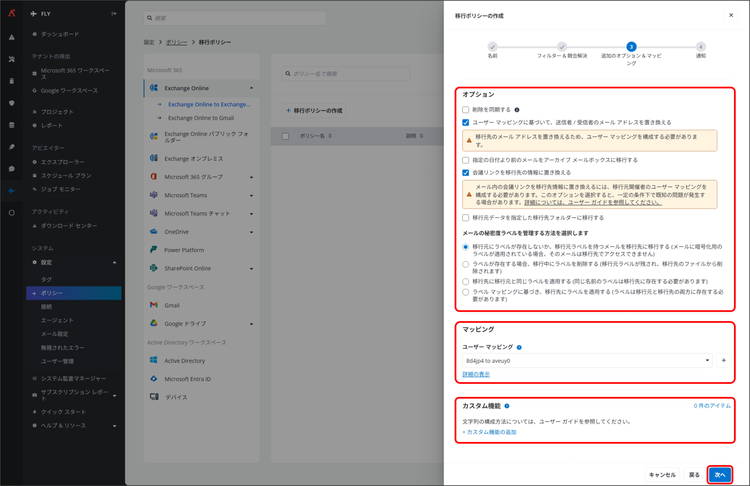 5. 移行ポリシーの作成 ③追加のオプション&マッピング 画面が表示されるので、下記項目に任意の設定を実施して [次へ] をクリックします。