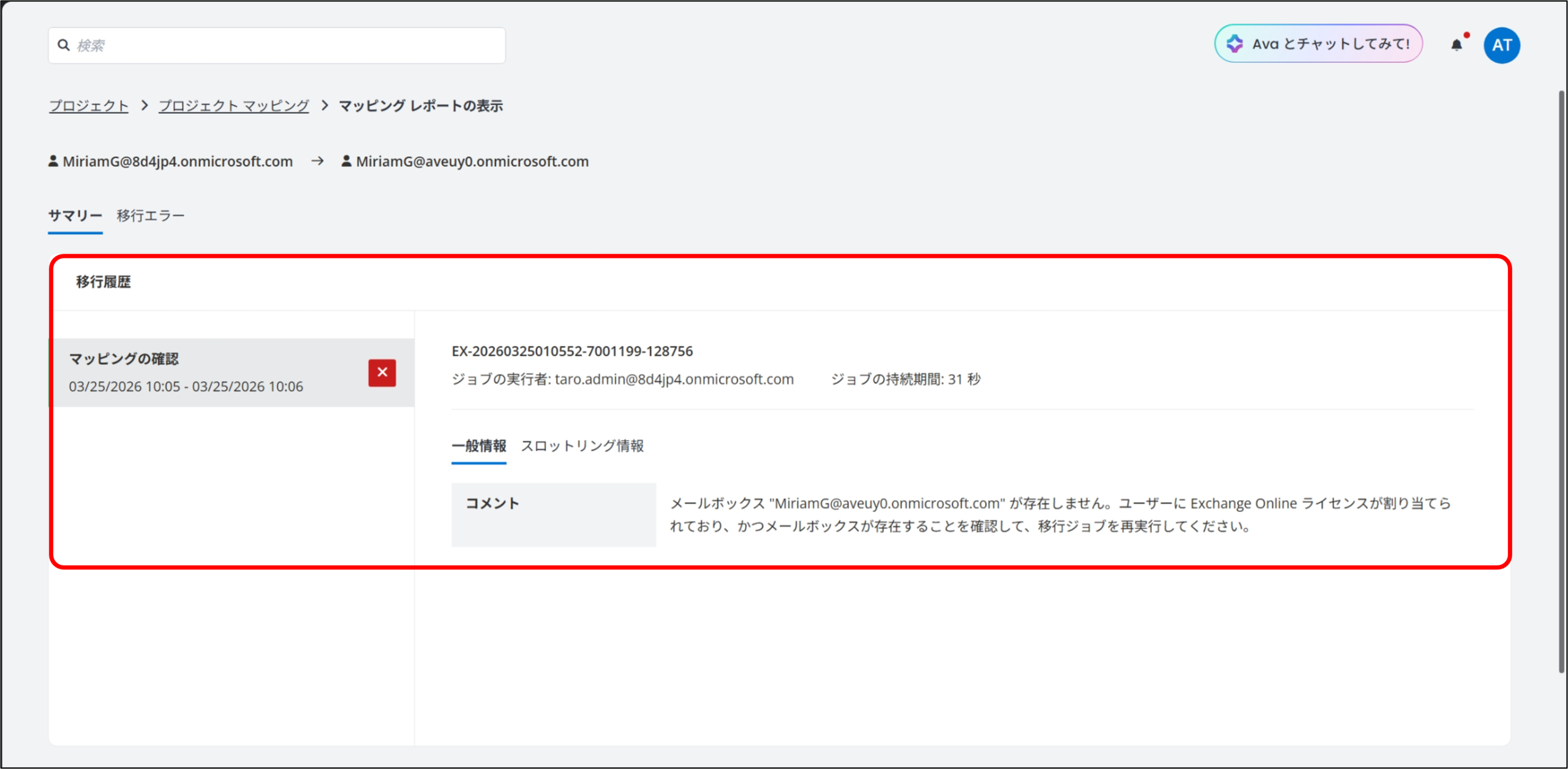- 移行先として指定した共有メールボックスが存在しない場合