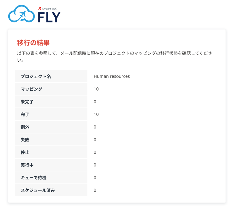 以下は、完全移行実行後の移行結果確認例です。