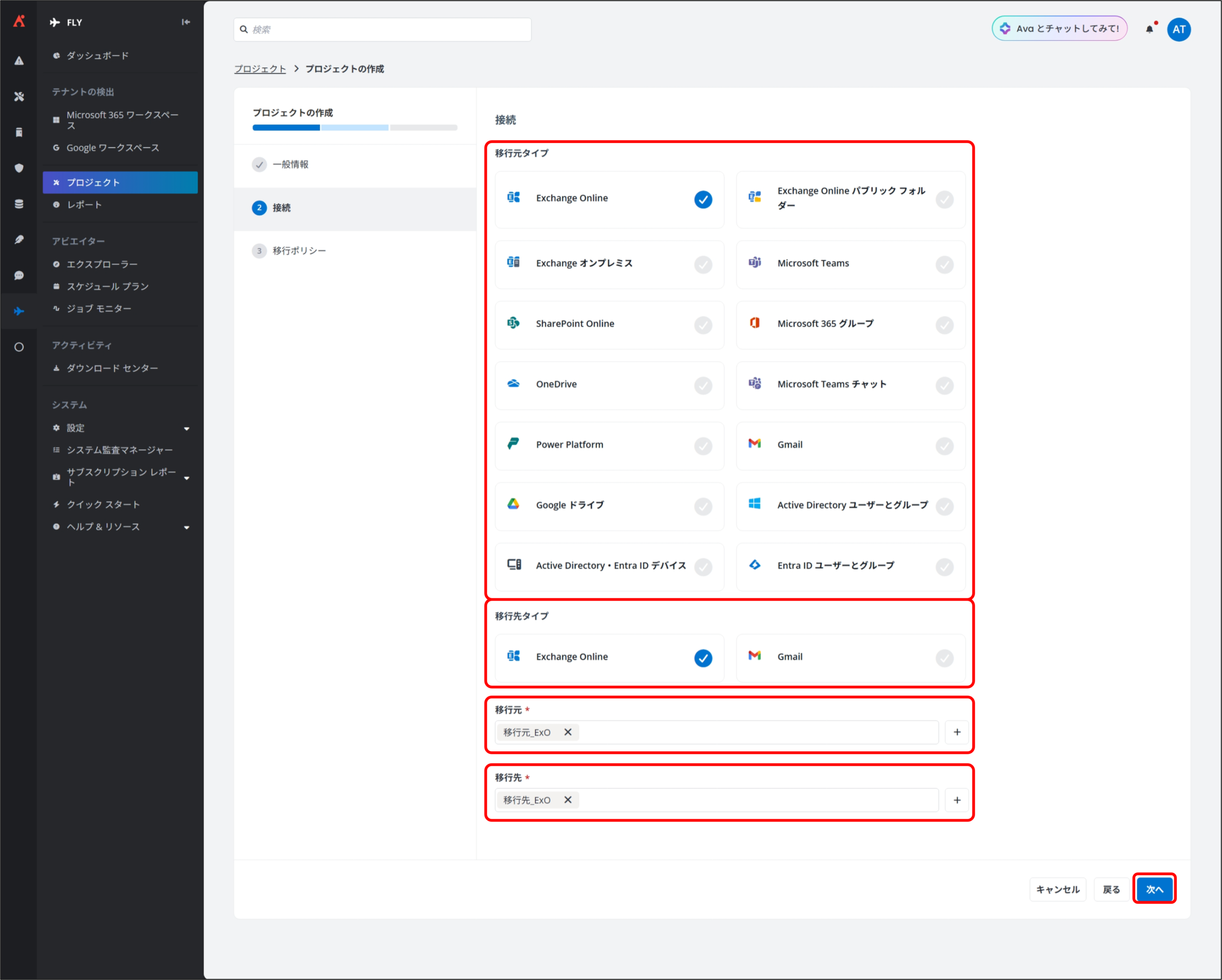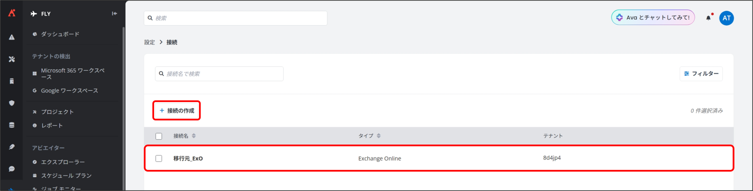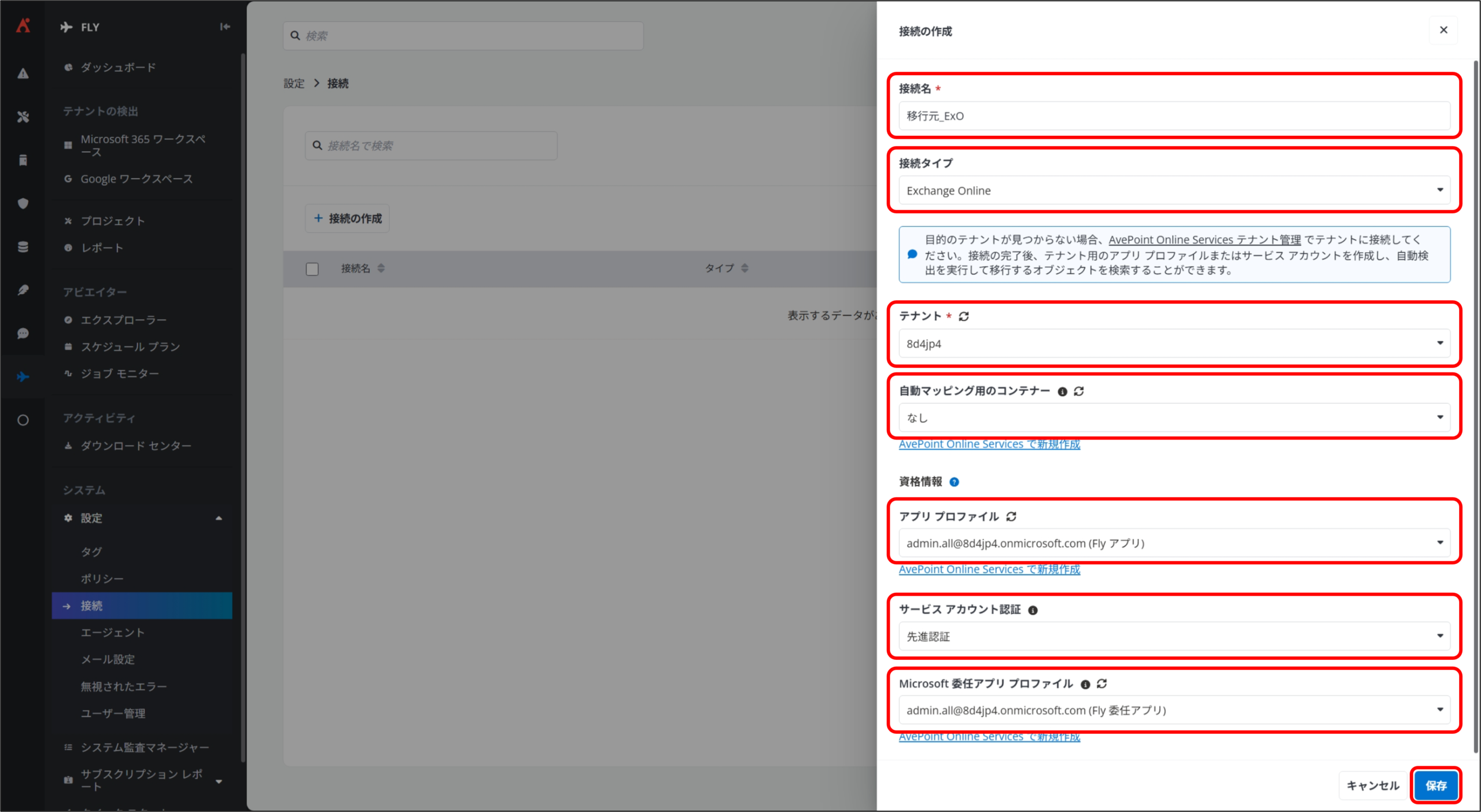 Fly では、移行元および移行先の Microsoft 365 テナントと通信するために、「接続」を作成します。