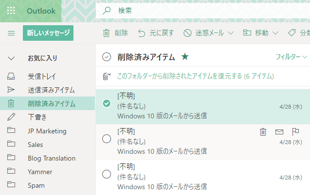 別フォルダー(復元可能なアイテム > 削除済みサブ フォルダー) 内のアイテムも、保持期間内であれば、 Outlook Web アプリの「削除済みアイテム」画面から、専用の復元メニューを使って復元可能です。