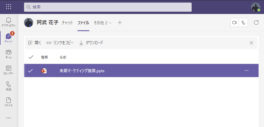 - 個人チャットやグループ チャットで共有されたファイルは、 OneDrive for Business フォルダーに保存されます。
