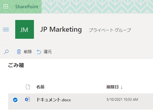 Microsoft がまだ復元をサポートしていない Planner のタスクを除き、ファイルなど SharePoint に保存されているデータについては、Microsoft 365 グループを削除した後 30 日以内であれば、SharePoint のごみ箱から削除済みアイテムを復元することが可能です。