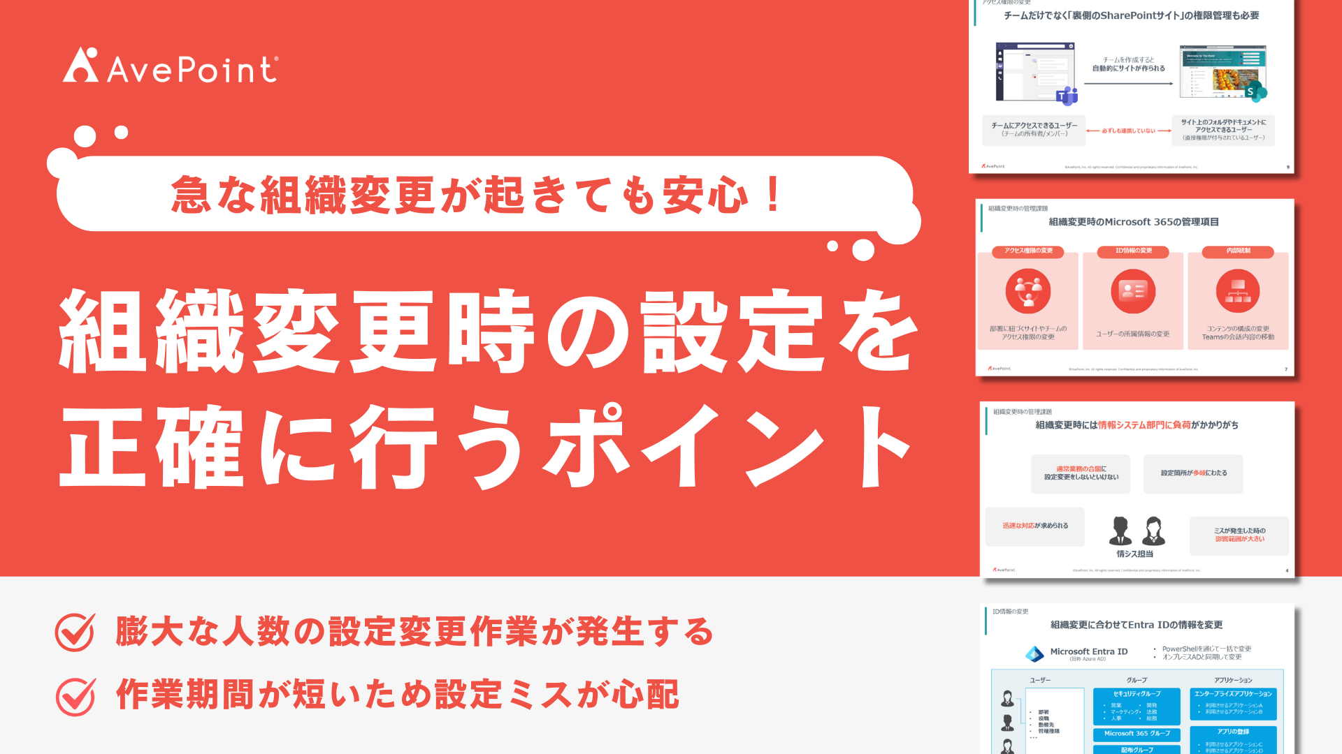 組織変更時などに、管理者が誤って設定を変更し、ユーザーやグループ情報が大規模に書き換えられる。復旧に時間がかかるこ業務が滞る。