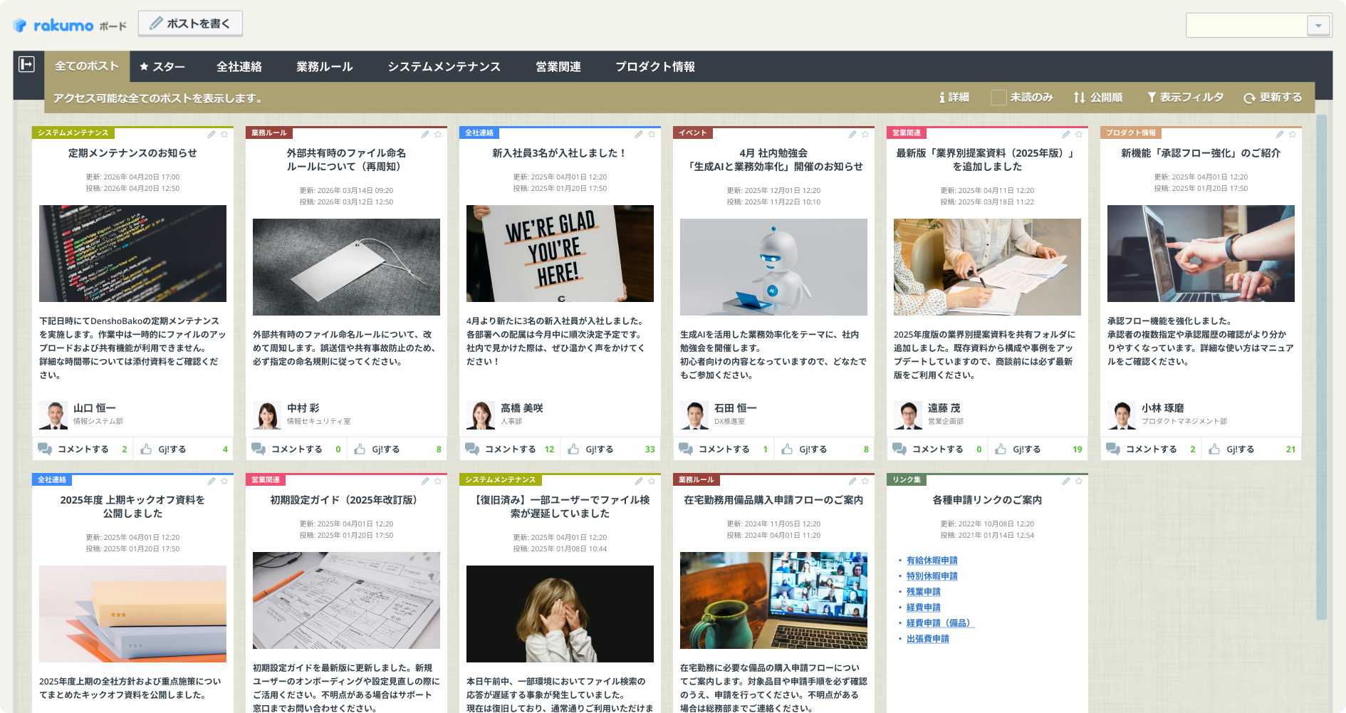 投稿に対する「グッジョブ!」(リアクション)やコメント機能により、情報の認知だけでなく、従業員同士のポジティブな相互作用を生み出します。